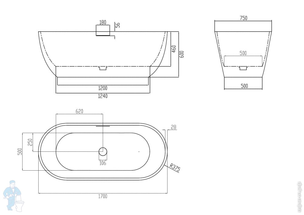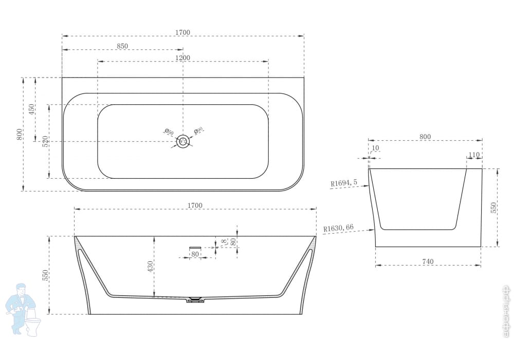 Ванна из искусственного камня Abber Stein (1700x750) отдельностоящая, слив-пер, белая мат AS9624-1.7Код: 324789