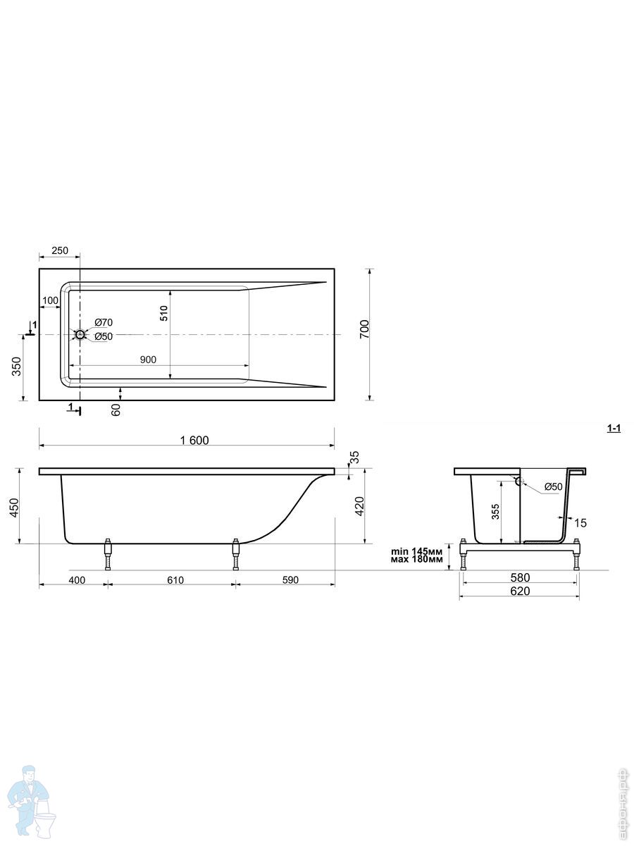 Ванна из искусственного камня Abber Dortmund (1700x750) отдельност, слив-пер, черно-бел мат AM9911BWКод: 324747