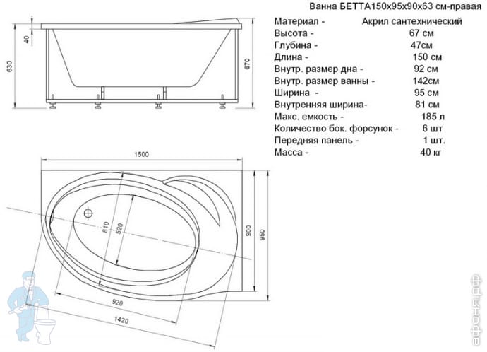 Ванна БЕТТА Акватек (150х95) из литьевого акрила