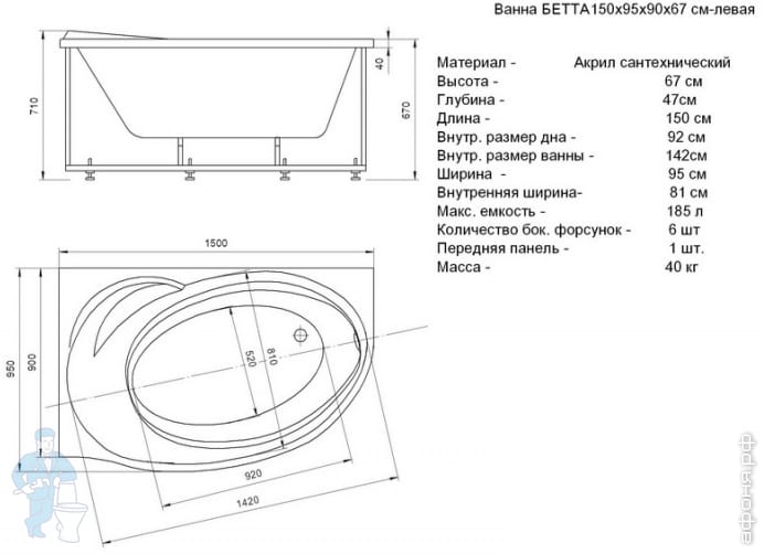 Ванна акриловая Акватек БЕТТА 150х95 левая,гидромассаж премиум гамма,ПН.упр.,фрон.панель,каркас,сливКод: 81011